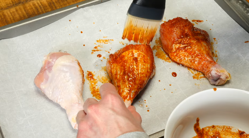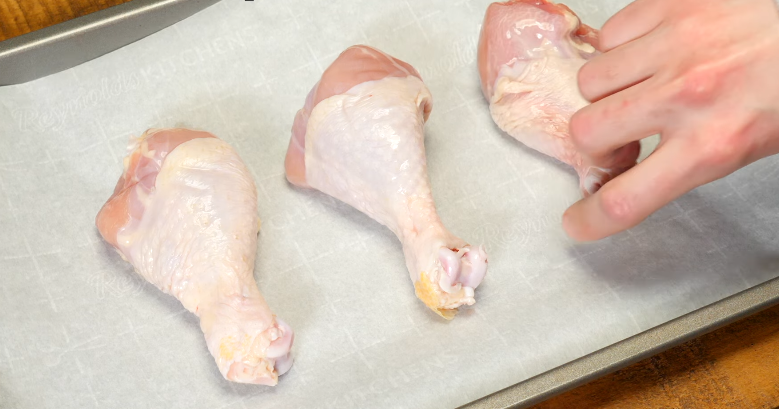 Pat the drumsticks dry with paper towels. This step matters because dry skin = crispy skin.