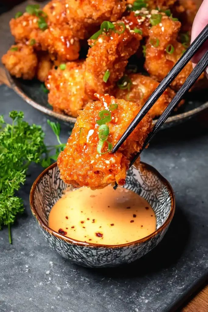 Place fried chicken in a large bowl. Drizzle the bang bang sauce over and toss gently to coat. Don’t dump all the sauce at once — start with half, toss, then add more if needed. This prevents soggy breading.