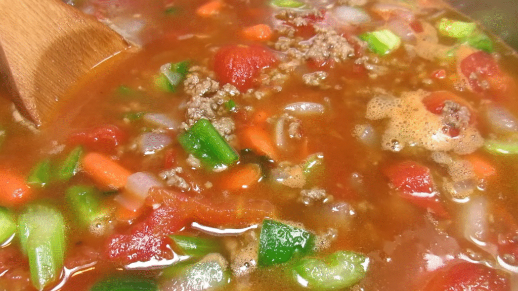 Think of Hamburger Soup as the coziest mix of a beefy stew and a veggie-packed broth. It’s made with ground beef, potatoes, carrots, celery, tomatoes, and a flavorful broth — all simmered together until everything melts into one rich, comforting bite.