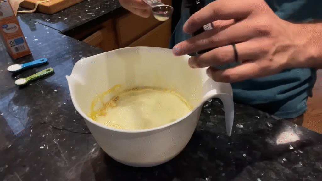 Mix in the melted butter, sugar, egg, vanilla, and sourdough starter. Stir until everything blends together into a smooth, creamy mixture.
