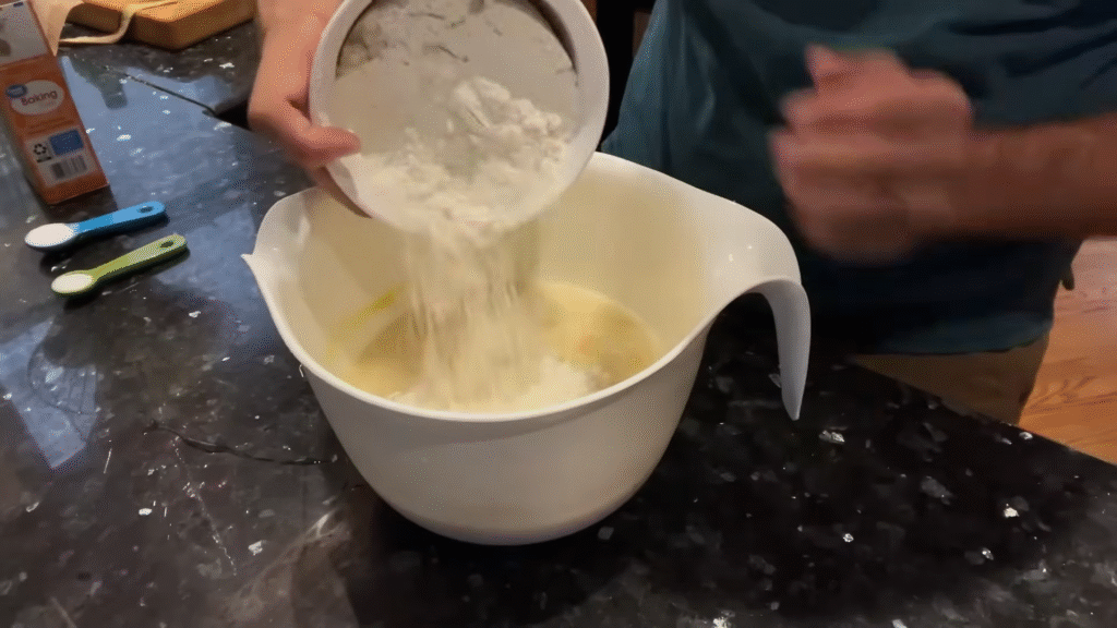 Gently fold the dry ingredients into the wet mix. Don’t overmix — just stir until you don’t see flour streaks anymore. If you’re adding nuts or chocolate chips, now’s the time.
