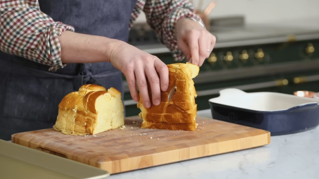 Cut your bread into small cubes—nothing perfect, just bite-sized chunks. Use day-old or slightly dry bread so it soaks up the custard nicely. You can use white bread, brioche, challah, or even croissants if you’re feeling fancy.