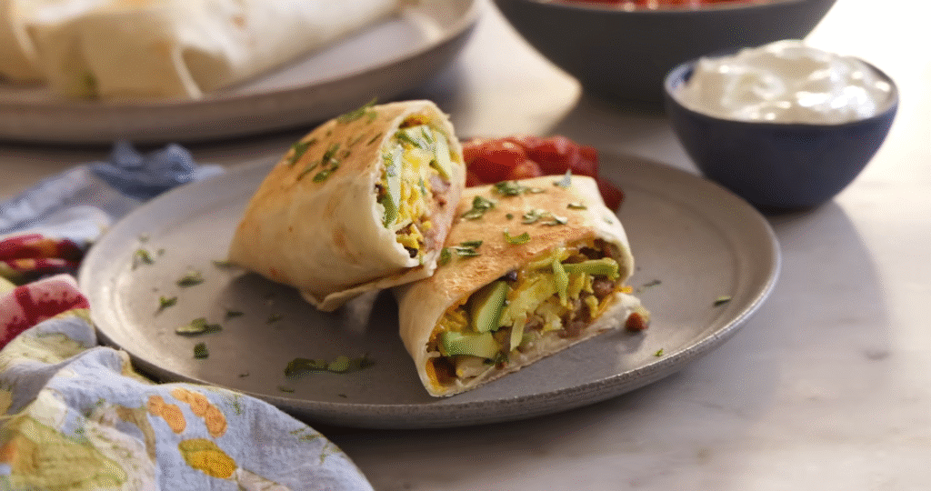 Tortilla + scrambled eggs + cheese + veggies = happiness wrapped up. You can even add cooked chicken or beans for extra protein.