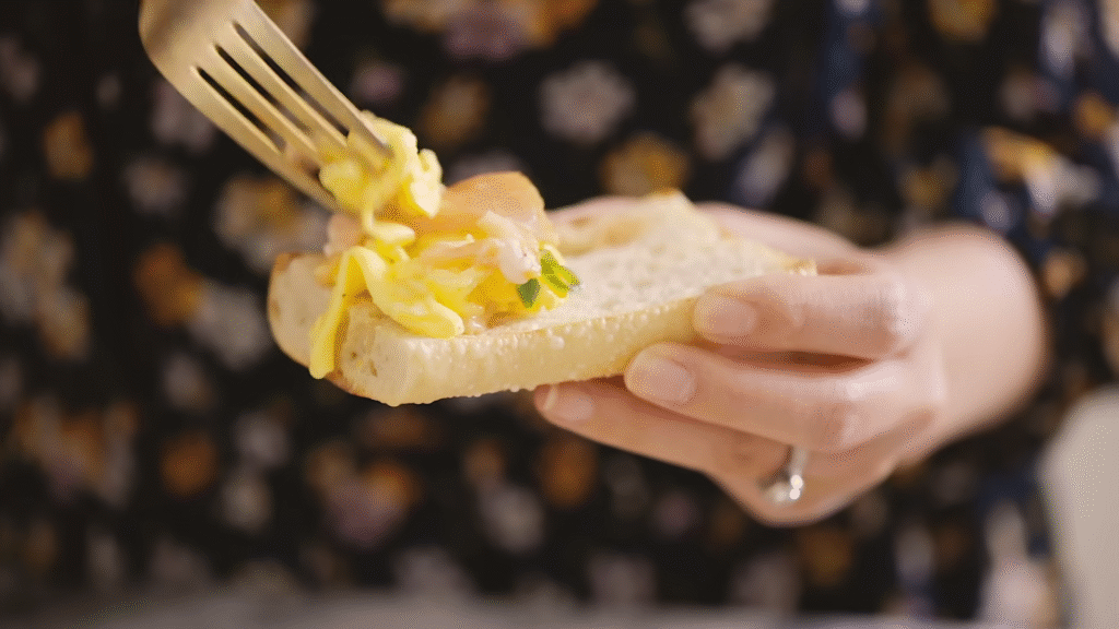 Crack a few eggs into a bowl, add a splash of milk, a pinch of salt and pepper, then whisk. Pour into a non-stick pan and stir gently with a spatula. Slow and low — that’s the secret. They’ll turn creamy, soft, and way better than those dry, rubbery ones.