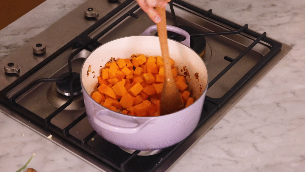 Throw in the chopped butternut squash. Stir everything together and cook for another 5 minutes.