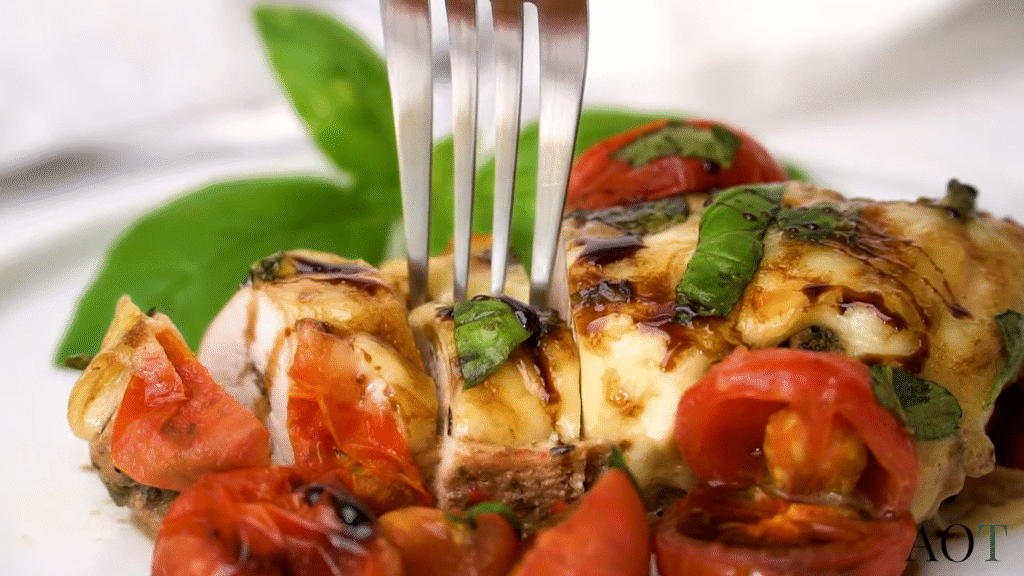 This is a twist on the classic Italian salad. Think melty mozzarella, juicy tomatoes, and fresh basil stacked on top of golden chicken breasts. Then drizzle with balsamic glaze — oh yes.