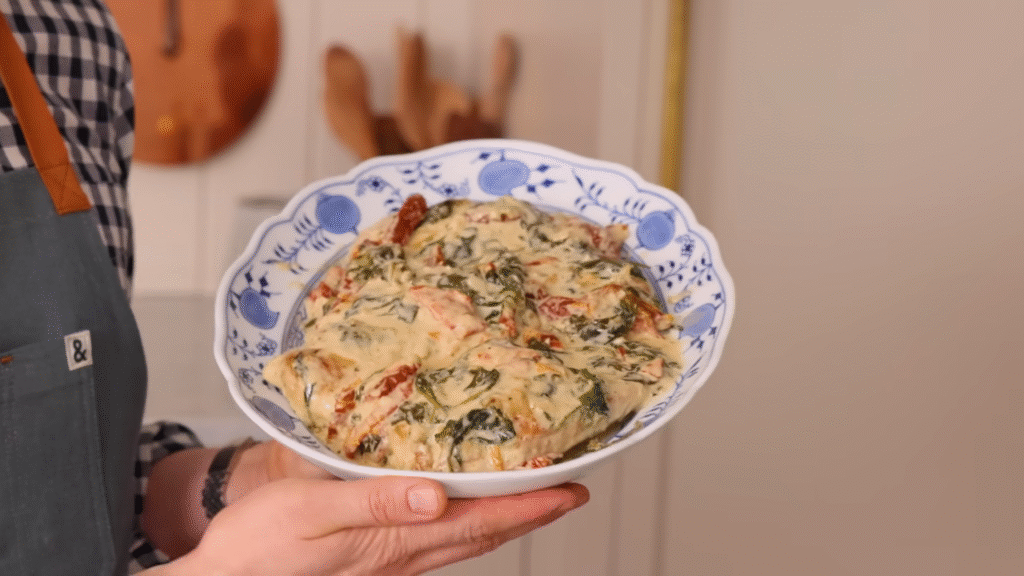 This one is pure comfort. Imagine chicken simmered in a creamy sauce with spinach, garlic, and sun-dried tomatoes. It’s rich, cozy, and pairs perfectly with pasta or rice.