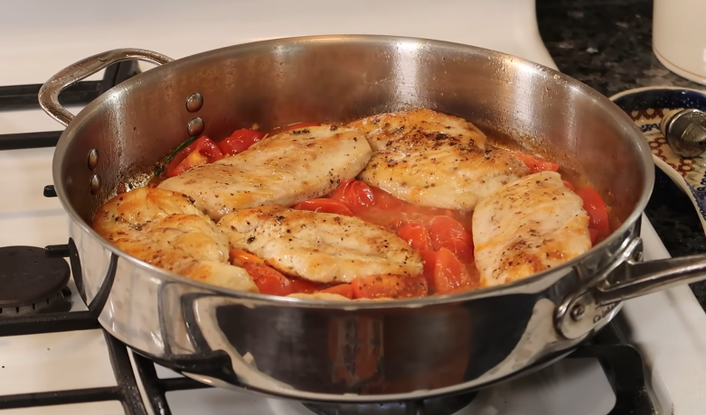 Once the chicken is almost done, place slices of mozzarella and tomato on top of each breast. Cover the pan with a lid for 2–3 minutes so the cheese melts slightly.