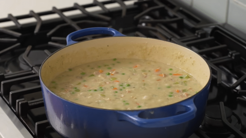 In a small bowl, mix 2 tablespoons of flour with 1 cup of milk or cream. Slowly pour this mixture into the pot while stirring. This makes the broth thick and creamy—like a cozy hug in liquid form.