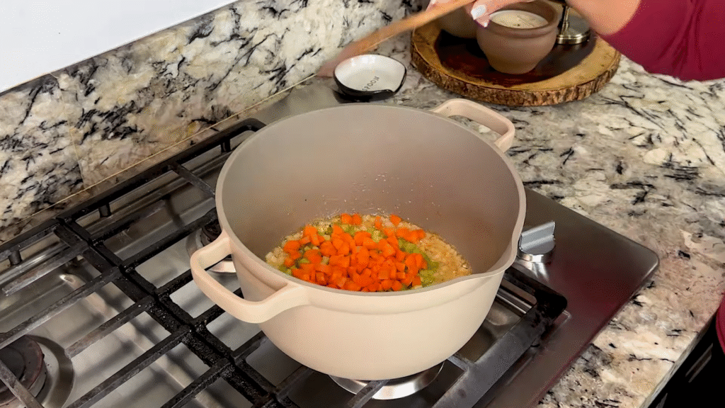 In a large pot, melt butter with olive oil. Add chopped onion, celery, and carrots.