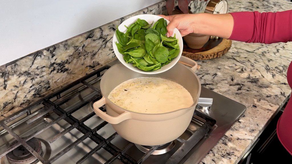 Now the fun part — drop in the gnocchi! Let them cook for about 3–5 minutes, or until they float to the top. Add your spinach and watch it wilt beautifully into the soup.