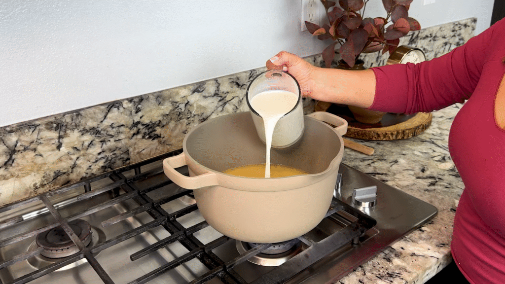 Lower the heat. Add the heavy cream, thyme, salt, and pepper. Stir it all together — this is where that silky texture starts forming. You’ll see it turn creamy right before your eyes.