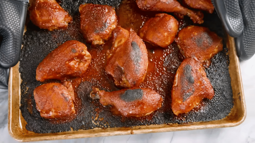 Brush chicken pieces with your favorite BBQ sauce and bake them until they’re sticky and caramelized. The sauce thickens beautifully, creating that perfect glaze.