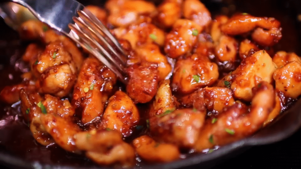 You’ll whisk together honey, soy sauce, garlic, and a little vinegar. Pour it over seared chicken thighs and let it simmer until it becomes thick and glossy.