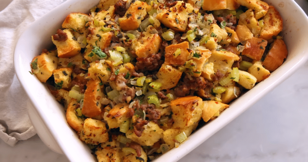 This dish smells like Christmas itself. Cubed bread, cooked sausage, celery, onion, and fresh herbs all baked together. It’s soft on the inside, crispy on the top, and full of cozy flavors.