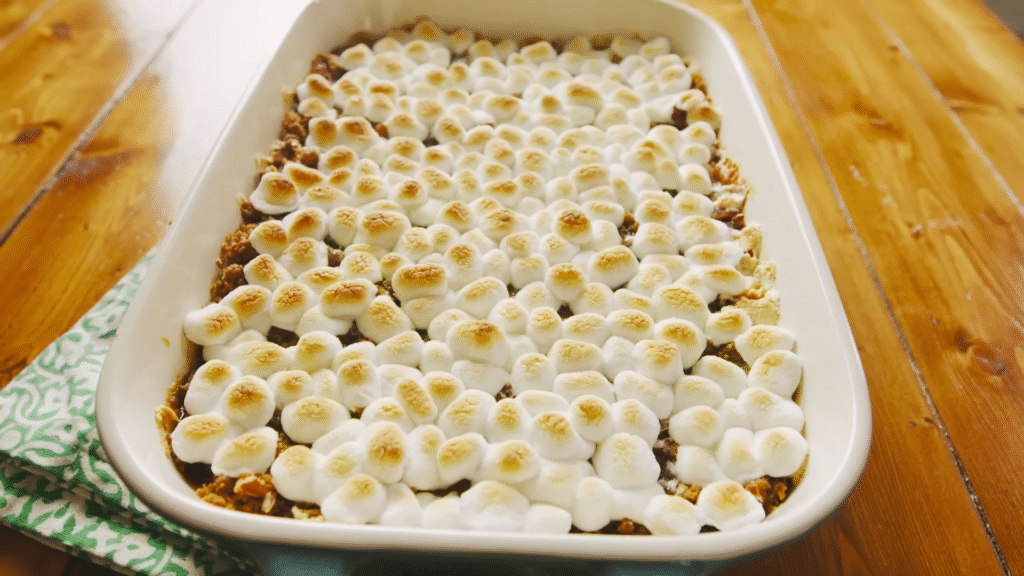This one’s sweet enough to double as dessert. Creamy mashed sweet potatoes topped with fluffy marshmallows and a brown sugar crumble — it’s nostalgic and festive in every bite.