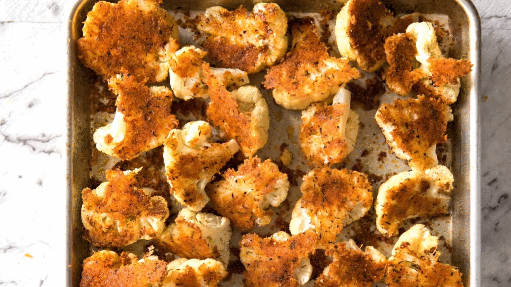 This one’s for when you want a veggie dish that doesn’t feel boring. Coat cauliflower in olive oil, garlic, and Parmesan, then roast until crisp and golden. Even picky eaters will love it.