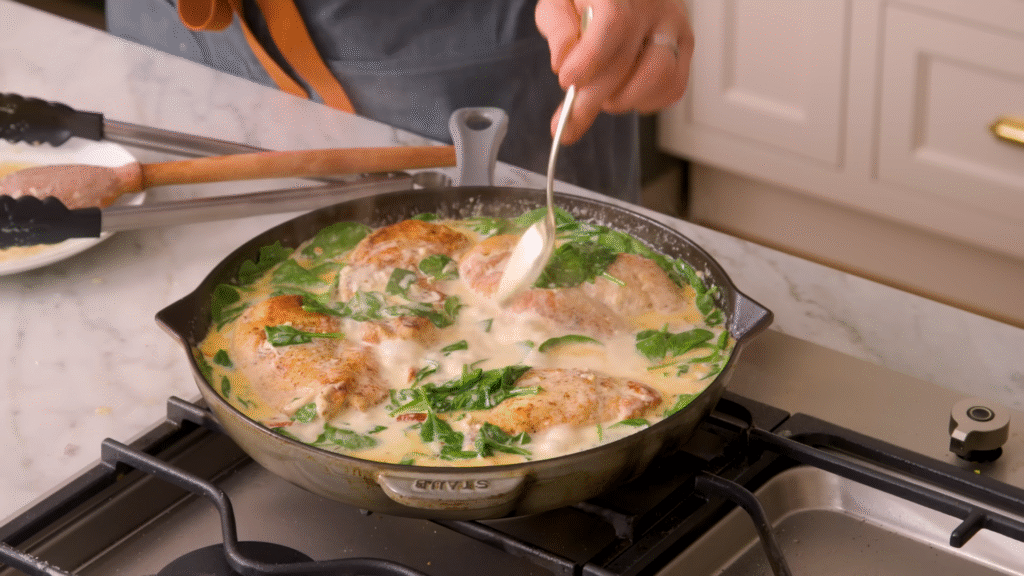 This dish looks like it came from a restaurant, but it’s ridiculously easy. Juicy chicken breasts simmered in a creamy garlic sauce with sun-dried tomatoes and spinach—it’s rich, flavorful, and ready in 30 minutes. Serve it with pasta or mashed potatoes for the ultimate comfort combo.