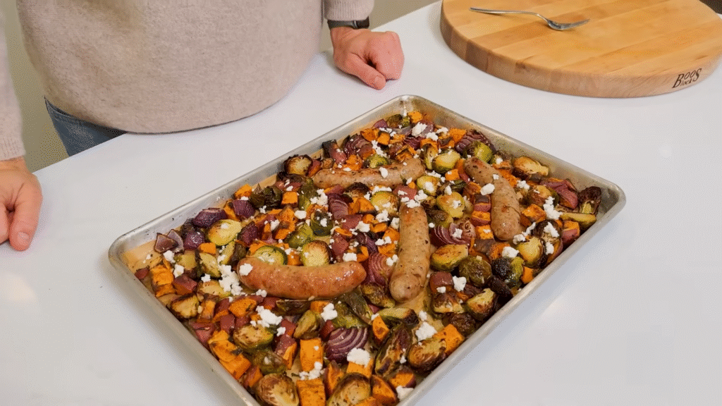 Not every winter dinner needs to take hours. This one’s fast, flavorful, and filling. I chop up some sausage, toss it with potatoes, peppers, and onions, season with olive oil and herbs, and roast everything until golden. Easy cleanup, full stomach, happy me.
