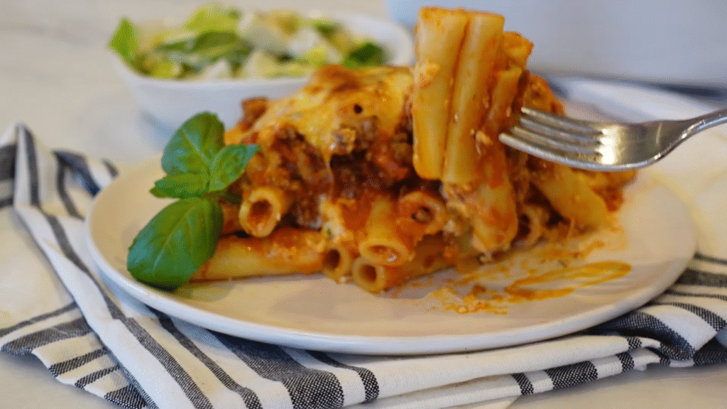 Basically, lasagna’s less complicated cousin. Pasta baked in marinara and cheese—simple, cheesy, and deeply satisfying. I make this when I want something to share with family or friends because it feeds a crowd and makes everyone happy.