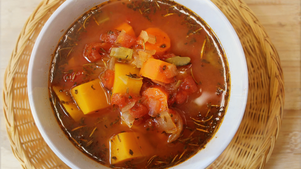 If you want something healthy but still warm and satisfying, this one’s for you. It’s loaded with fall veggies — carrots, potatoes, zucchini, corn, beans — all simmered in a flavorful tomato broth.