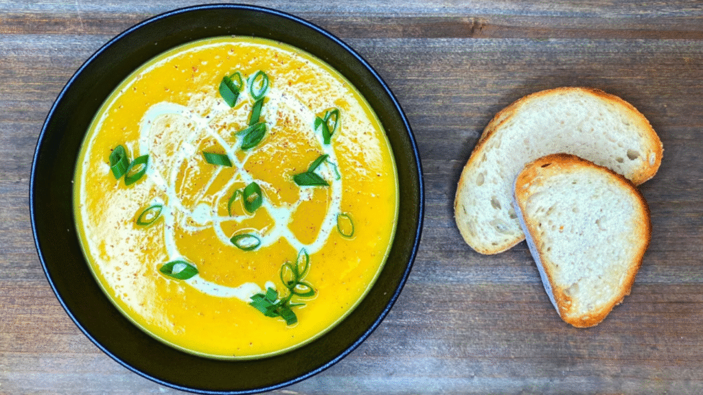 This one screams fall. It’s rich, smooth, and perfectly creamy — like autumn in a bowl. The sweetness of the pumpkin blends beautifully with a hint of nutmeg and garlic. I love topping it with roasted pumpkin seeds and a drizzle of cream.