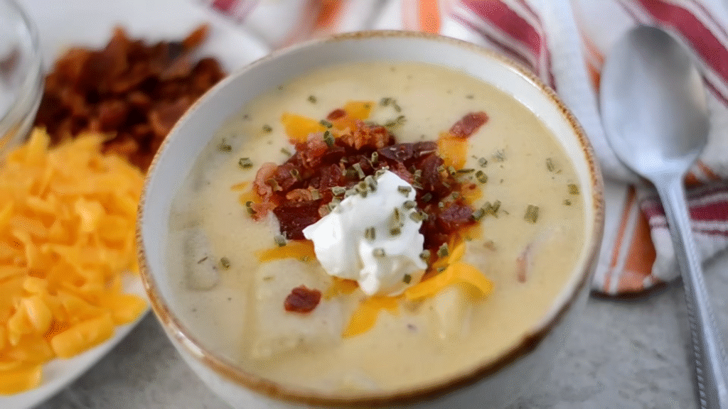 This one is thick, creamy, and hearty enough to be a full meal. Think baked potato — but in soup form. It’s packed with crispy bacon bits, melted cheese, and chives. Perfect for a cold evening when you need something rich and filling.