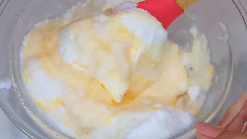 Now, gently fold the yolk mixture into the whipped whites. Do this slowly so you don’t lose the air you just whipped in.
