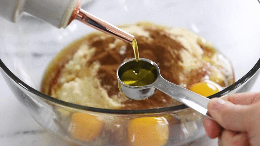 Slowly add your dry mix into the wet mix. Gently stir with a spatula — don’t overmix. If you’re adding nuts or chocolate chips, now’s the time.