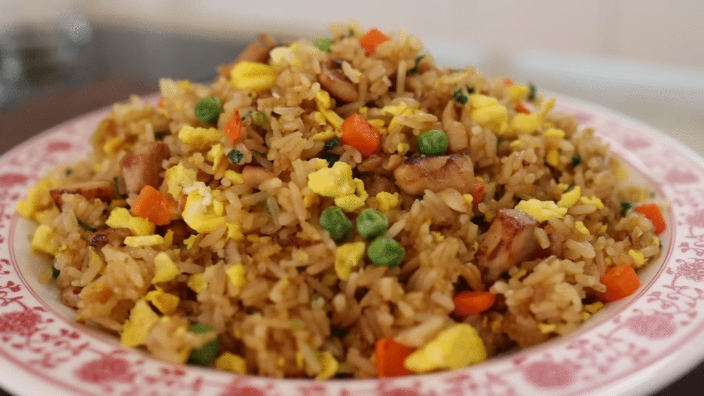 Just stir-fry rice, chicken, eggs, and frozen veggies with a splash of soy sauce. It’s colorful, filling, and tastes like takeout.