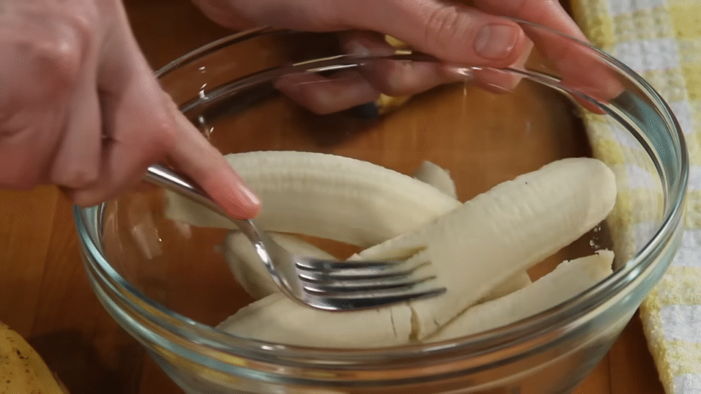 Take your ripe bananas and mash them with a fork until smooth. I usually leave a few small lumps for texture — gives it that homemade feel.