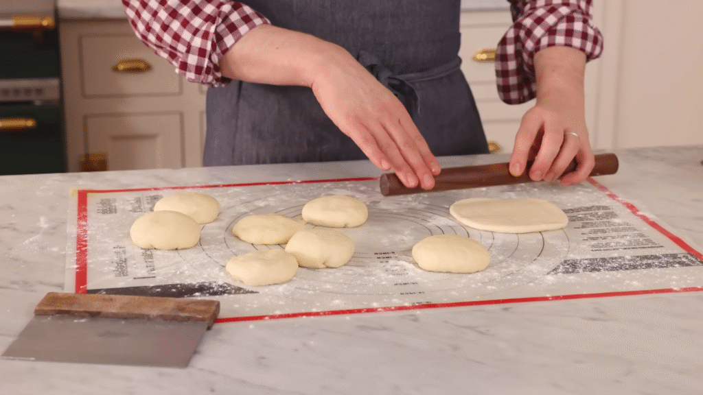 Once the dough has risen, punch it down gently. Divide it into 6–8 balls. Roll each ball into an oval or tear-drop shape — not too thin, not too thick.