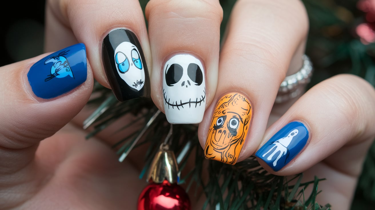 If you adore Zero (and who doesn’t?), paint your nails white with ghostly details. Add tiny red noses and ghost tails. It’s simple, sweet, and screams holiday magic.