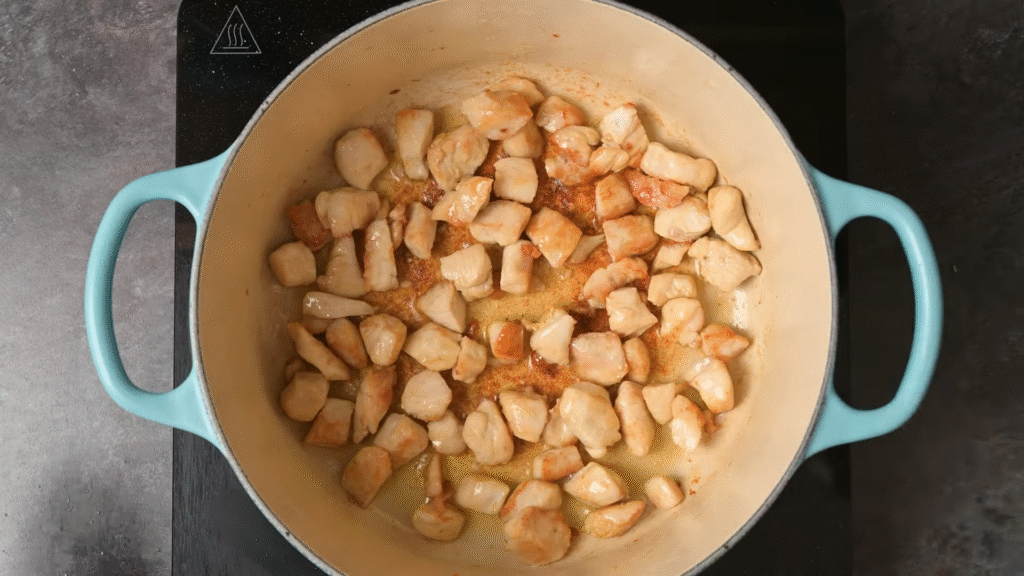 Add your chicken pieces, season with salt and pepper, and cook until golden brown on both sides (about 5–7 minutes).