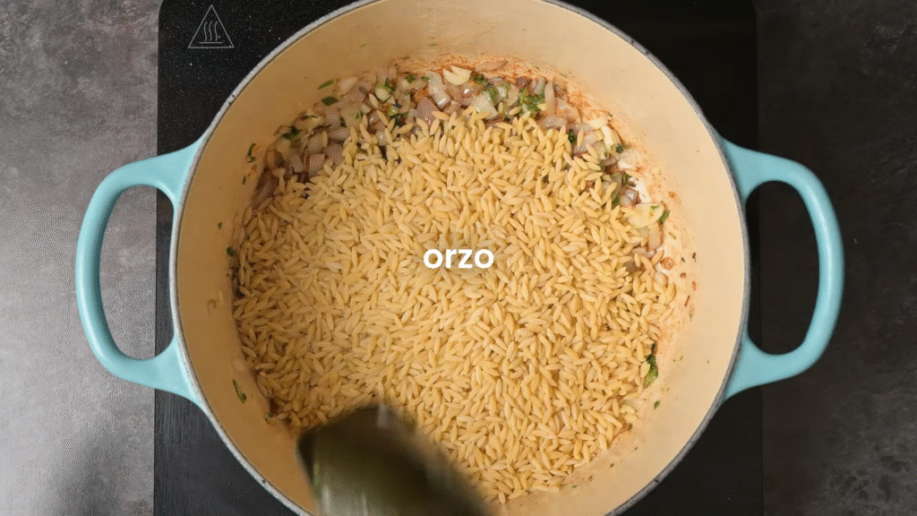 Orzo looks like rice, but it’s actually a type of pasta. It cooks quickly, absorbs flavor beautifully, and gives a creamy, risotto-like texture without the effort of making risotto.