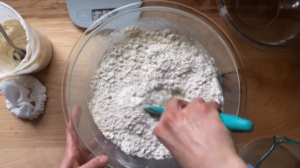 If it looks rough and shaggy β good. Thatβs exactly what we want. Cover it with a towel and let it rest for 30 minutes. This short break helps the flour absorb the water and makes kneading easier later.
