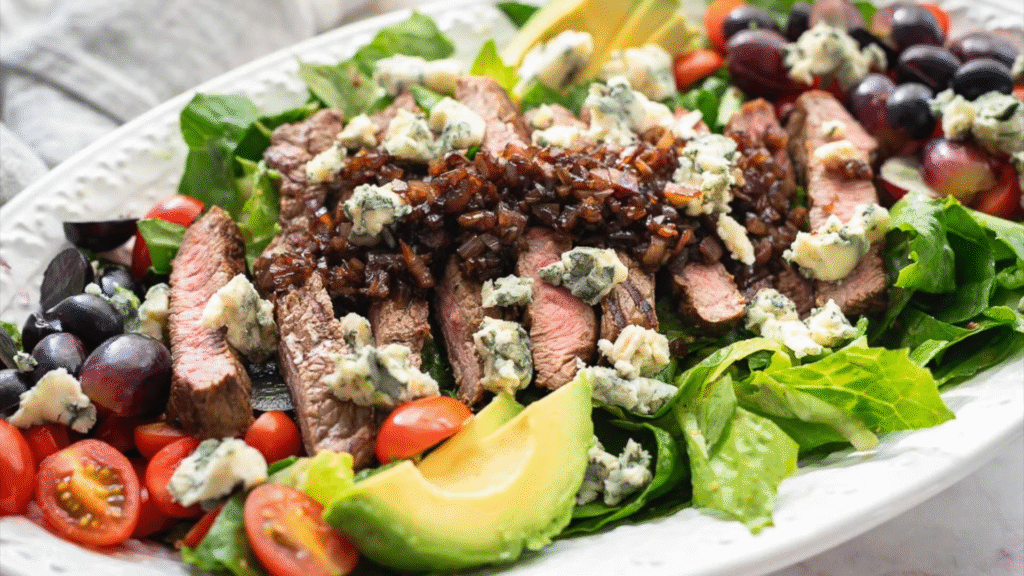 When you want something lighter but still crave steak — this is it. Add sliced steak over a bed of greens, cherry tomatoes, red onion, and feta cheese. Drizzle with balsamic dressing. It’s fresh, zesty, and satisfying without being heavy.