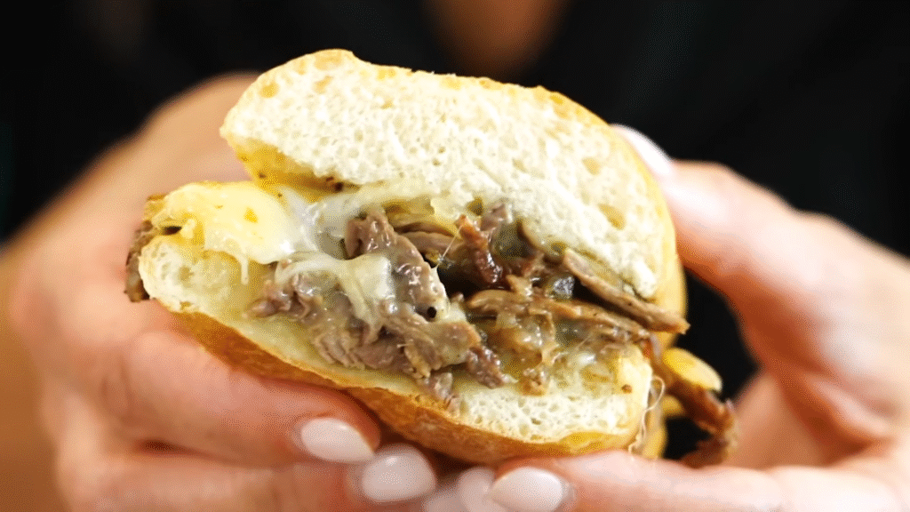 This is comfort food heaven. Thinly sliced steak, sautéed onions, and melted cheese stuffed into a soft roll. Add some bell peppers if you like — it’s gooey, juicy, and perfect for movie night.