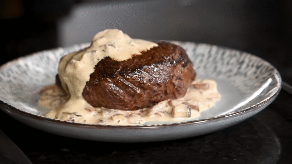 Fancy, but secretly simple. Crush black peppercorns, press them onto both sides of your steak, and cook it in a hot skillet. Then make a quick sauce with cream and a splash of brandy or beef broth. The pepper gives it that restaurant-style kick — it’s bold and beautiful.