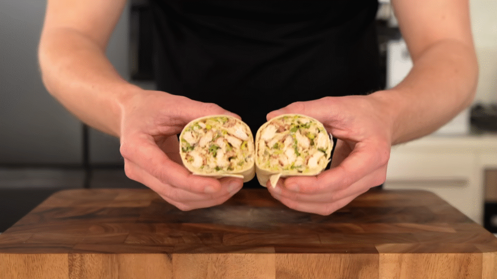 Sometimes you just want something handheld. Toss grilled chicken with Caesar dressing, lettuce, and parmesan, then wrap it in a tortilla. It’s fresh, crunchy, and feels fancy without any effort.