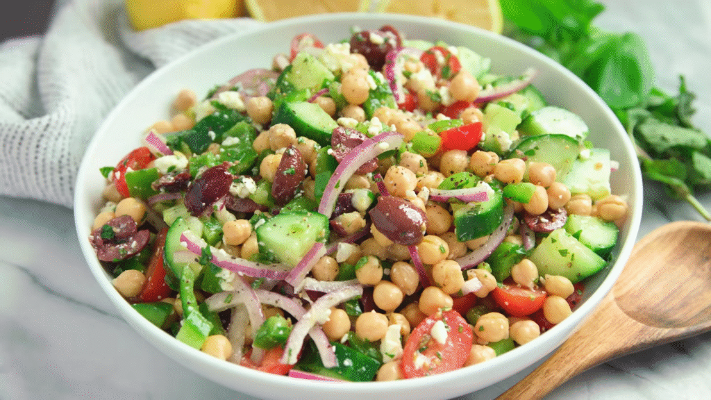 This is my go-to when I want something healthy but filling. Combine chickpeas, cucumber, red onion, tomatoes, and feta with olive oil and lemon dressing. It’s crunchy, tangy, and ready in minutes.