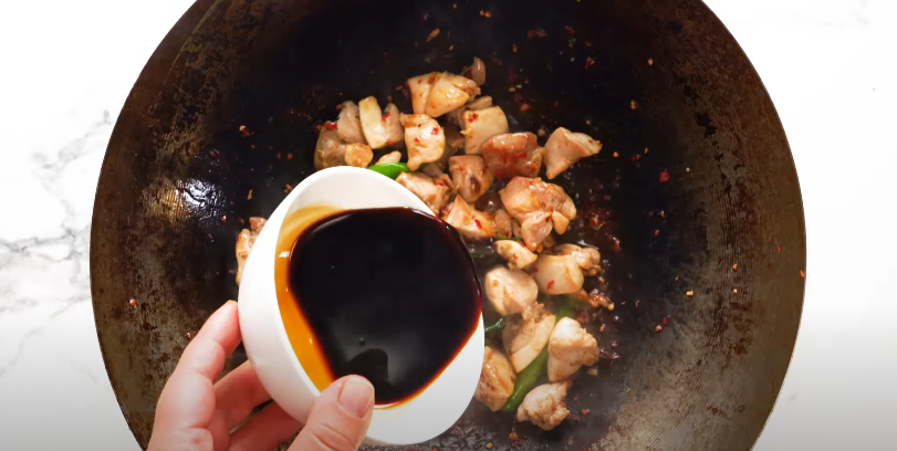 Pour in soy sauce, oyster sauce, fish sauce, and a pinch of sugar. Stir well so the chicken soaks up all that flavor.