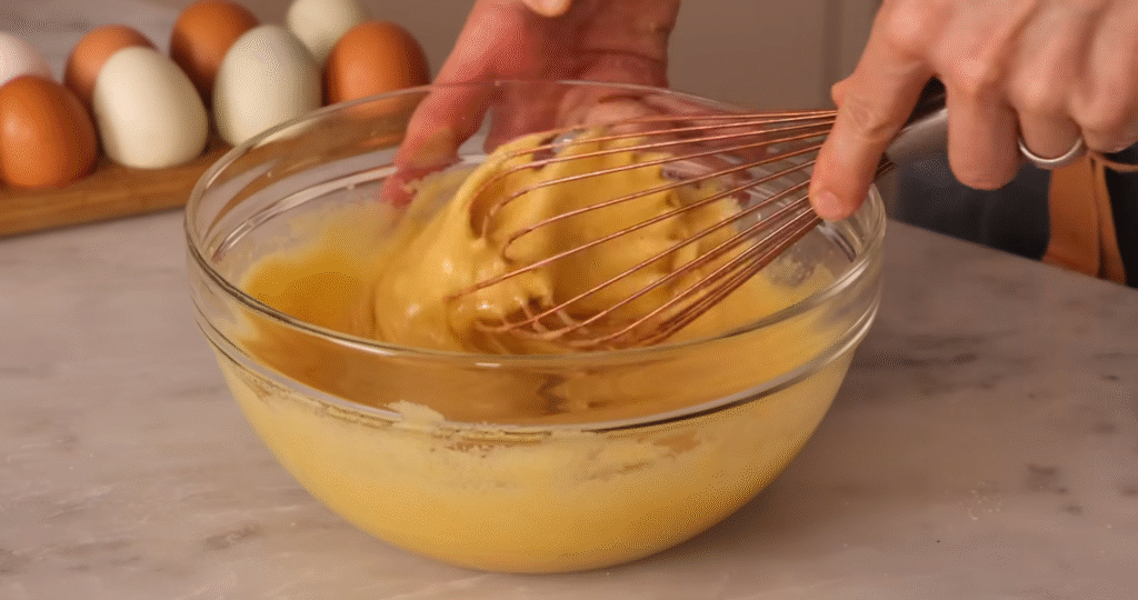 In a large bowl, whisk together eggs, sugar, oil (or butter), and vanilla. Mix until it’s smooth and creamy.